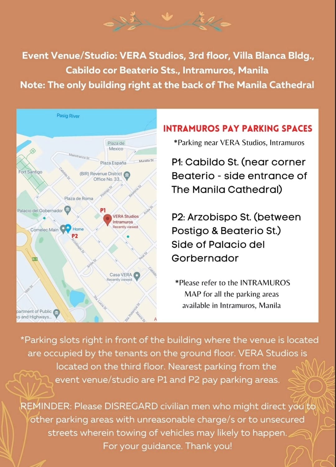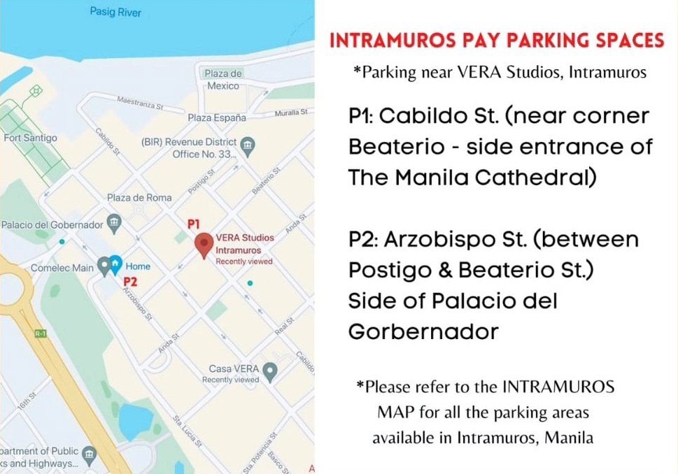 By Private Car: Use Waze or Google Maps to navigate to VERA Intramuros. Please allow extra time for Manila traffic. Limited parking is available nearby; additional parking can be found around Intramuros.